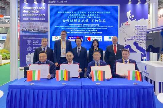 11月6日,浙江海港物流集团有限公司、嘉华航运(香港)有限公司、中欧商贸物流合作园区、威廉港集装箱码头营销有限两合公司在第七届中国国际进口博览会现场共同签署关于开通中欧快航(CEX)服务的合作谅解备忘录。“宁波-威廉港”中欧快航(CEX)预计于今年底首发,将会成为宁波舟山港至欧洲最快的直达航线,可将货物在途时间大幅缩减至26天以内,助力浙江高能级跨境电商国际枢纽省建设。 浙江省海港集团、宁波舟山港集团党委书记、董事长,宁波舟山港股份有限公司董事长陶成波,欧门集团销售总监于安·柯曼达,威廉港总裁豪斯瓦尔德,嘉华航运总裁刘月,中欧商贸园总经理田红兵共同见证四方签约。集团党委委员、副总经理倪彦博,股份公司党委委员、董事、副总经理姚祖洪等参加活动。 根据谅解备忘录,物流集团、嘉华航运、中欧商贸园和威廉港将协调各自资源,全力支持开通由宁波舟山港到德国威廉港的点对点中欧快航(CEX)服务,并依托相关铁路资源以及仓储设施,开拓由德国威廉港到匈牙利布达佩斯的海铁快运服务,有效辐射欧洲腹地。 伴随着“一带一路”倡议的大力推进,中国与欧洲的合作逐步深化,货品流通量不断增长,对物流服务提出了更高、更系统化的要求。在此背景下,物流集团于去年7月与威廉港签署合作备忘录,今年10月起正式入驻威廉港物流园区内的 P3 货运中心(一期),后续将积极推动地处德国的海港物流中心建设,进一步提升宁波舟山港供应链服务能级。